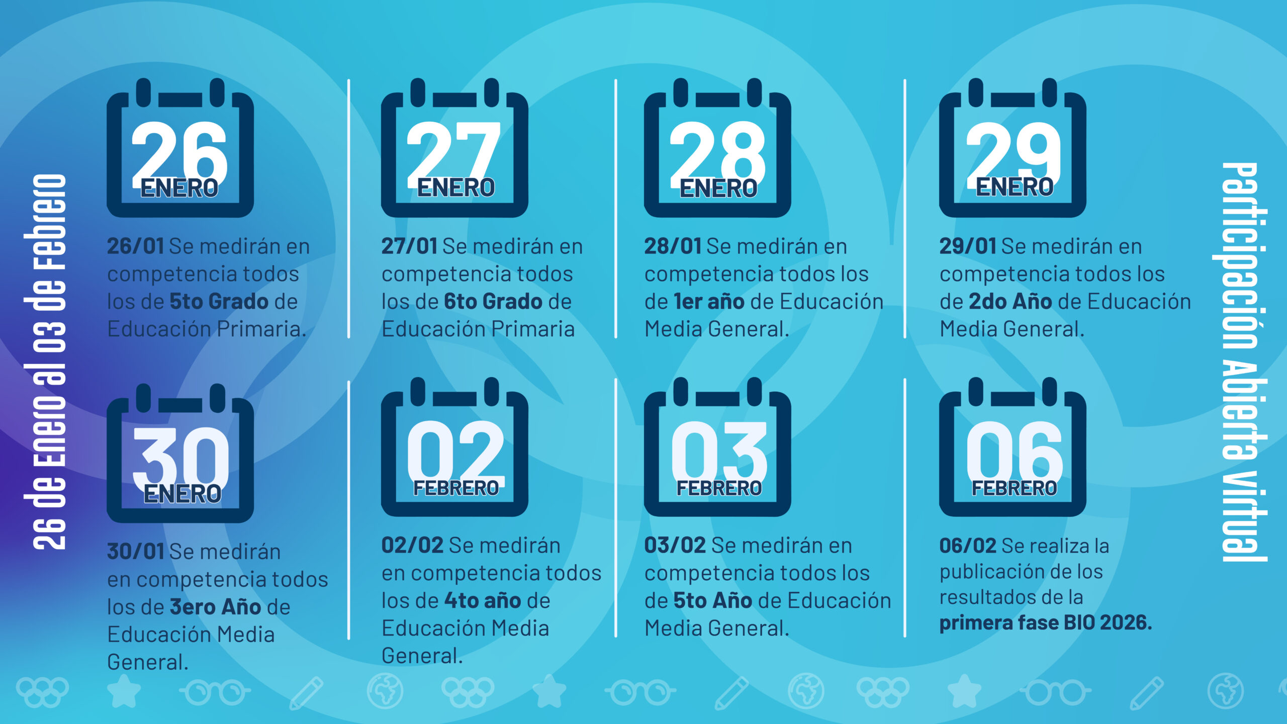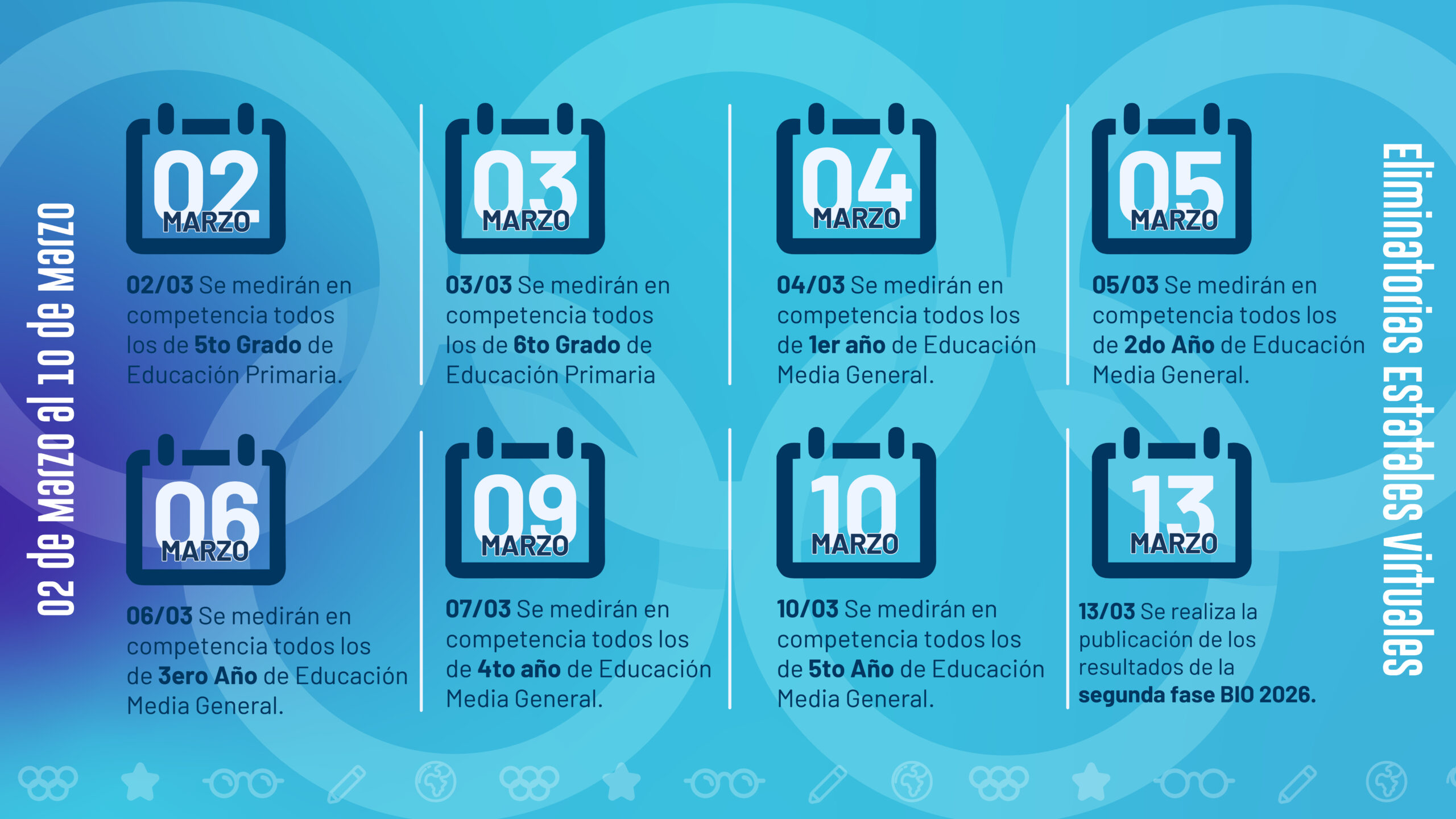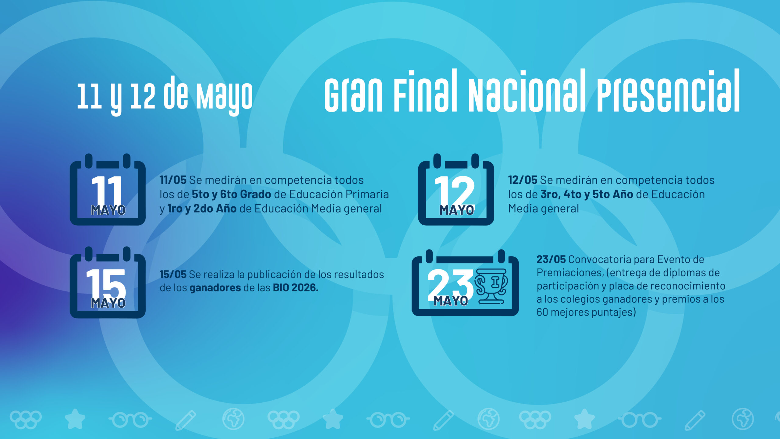 La delegación de colegios por estado se reúnen en la Capital del país, realizando una inscripción de $10 por alumno. Los 21 alumnos se enfrentan de manera presencial, en una competencia dividida en 2 días para seleccionar a los 60 ganadores. Todos presentan las pruebas correspondientes a cada aro olímpico, y obtendremos a los ganadores de las BIO NACIONALES 2026.